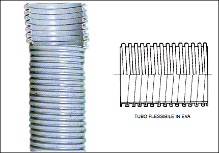 Tubo flessibile in EVA (etil-vinil-acetato) spiralato, senza armatura, di colore grigio azzurrino, è resistente a deformazioni permanenti, minima perdita di carico, massima curvatura senza strozzatura.